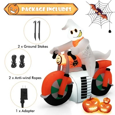 - Bright LED Lights: To make the inflatable decoration an attractive addition at the Halloween night party, the ghost and motor bike are fitted with internal LED lights to attract guests and trick or treat kids. One of the LED is right at the headlight of the motor bike to enlighten the evil face.