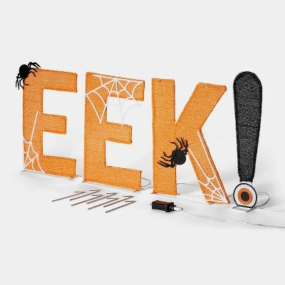 Brighten up Halloween night with this 18-Inch Mesh EEK! Orange Dewdrop Lights Halloween Decorative Word from Hyde & EEK! Boutiqueâ„¢. This Halloween decorative word sign showcases the word “EEK!” in orange, and it’s adorned with spiders and spiderwebs for a festive look. Complete with 70 dewdrop LED bulbs, this orange decorative word sign can be used both indoors and outdoors and comes with ground stakes for easy setup on your front lawn.