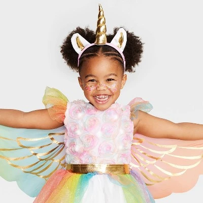 Your kid will be ready to spread their magical charm with the Light Up Rainbow Unicorn Halloween Costume Dress with Headpiece from Hyde & EEK! Boutique™. This rainbow unicorn costume dress features wings and gold-tone accents, and comes complete with a headpiece to complete the beautiful look. The soft and lightweight fabric helps keep them comfortable, while the light-up feature adds extra cool effect.