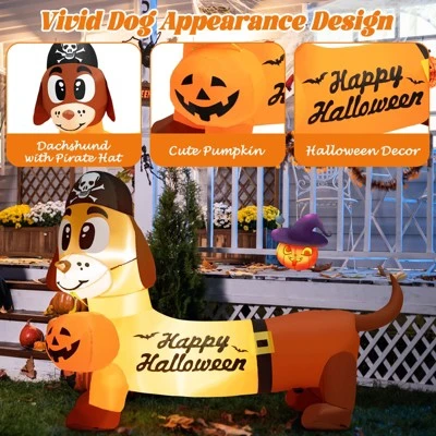 - Cute Pirate Dog with Pumpkin: The inflatable Halloween dog is designed with a 5.5FT Long dog with a pirate hat, a pumpkin in its mouth, and a wide body in orange to be an eye-catching decoration in the backyard, garden or lawn. The pumpkin with a smiling expression, which will be a unique view to welcome guests.
